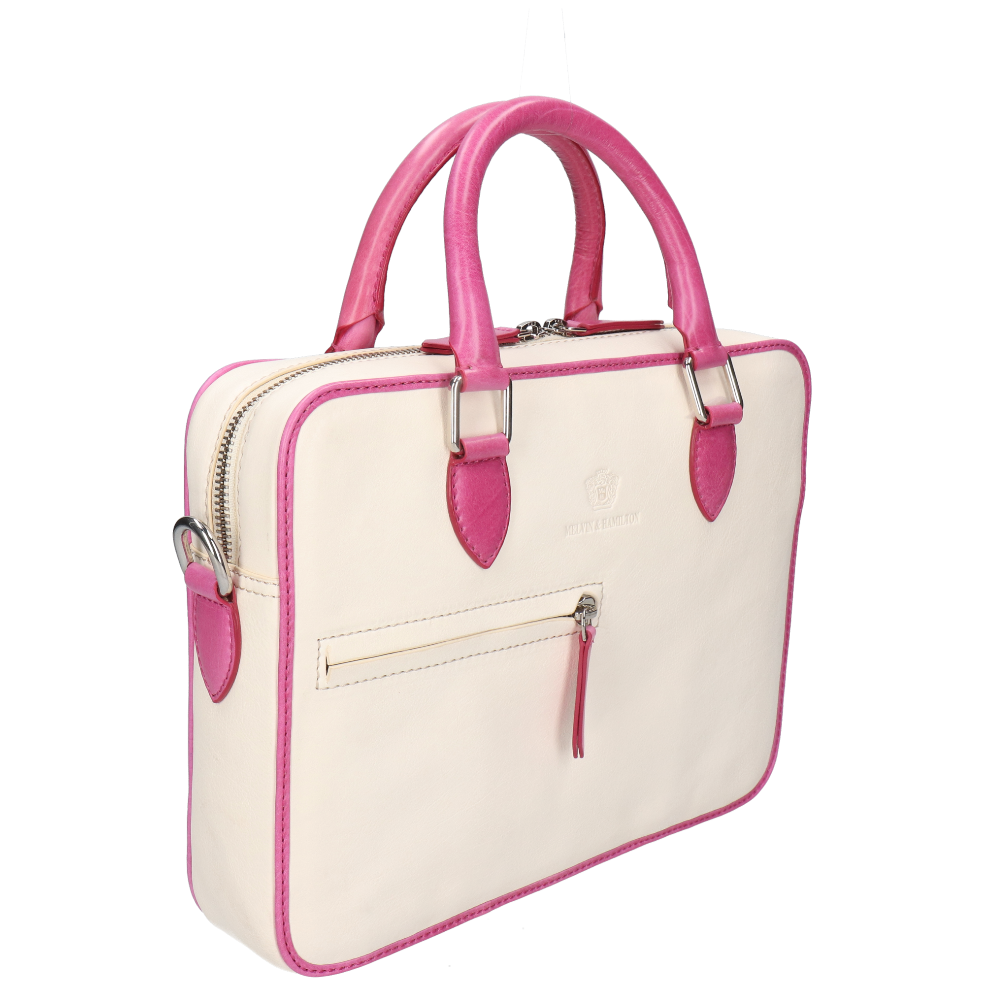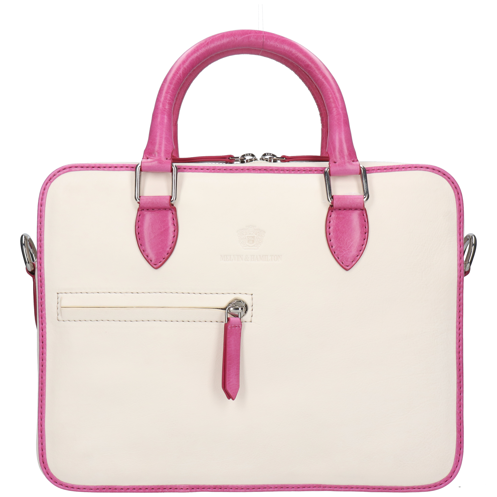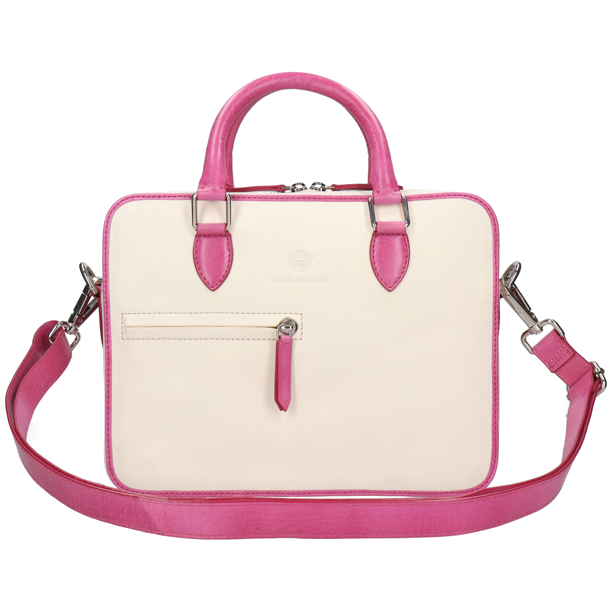 Voeg een vleugje elegantie toe aan je look met deze stijlvolle tweekleurige handtas! De Vancouver handtas van Melvin & Hamilton in chique wit en levendig roze is een statement stuk dat verfijning combineert met een gedurfde touch. Hij is gemaakt van koeienleer, heeft luxe leren handvatten en een roze veelzijdige crossbodyband, zodat je hem op jouw manier kunt dragen. Hij is ruim genoeg voor een tablet en je dagelijkse benodigdheden, en het gestructureerde silhouet en de verfijnde details maken hem de perfecte metgezel voor zowel fashionista vibes als casual uitjes. Blijf stijlvol en georganiseerd met dit opvallende accessoire!